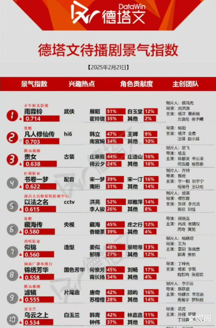 接下来来关注排在第七位的《似锦》。由景田、张晚意、郭涛、张弛等人联袂出演。这是一部根据漫画改编的古装逆袭剧。张晚意最近在古装剧的赛道上找到了自己的位置,《长相思》之后,越来越多的人觉得他具有男主范。而景甜也一步步走出了过往,开始迎接崭新的未来。祝福他们事业似锦!